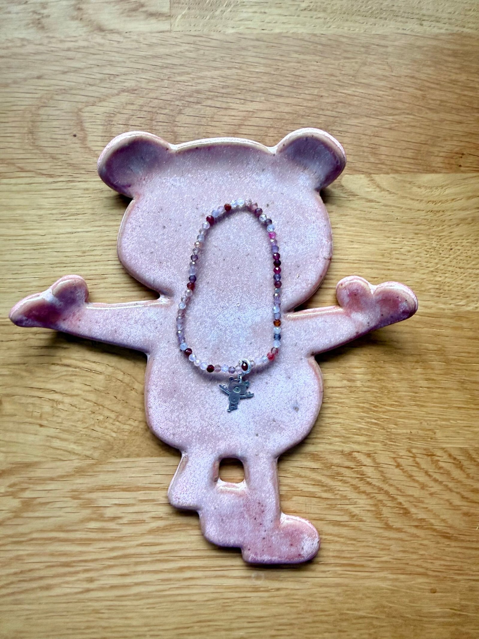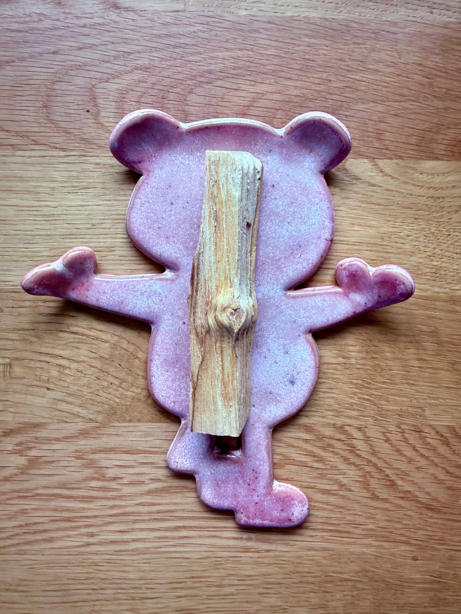 Wszechstronne naczynie w kształcie naszego logo Misia, na brązowej glinie z jasno różowym szkliwem, na którym znajdują się delikatne kropeczki.